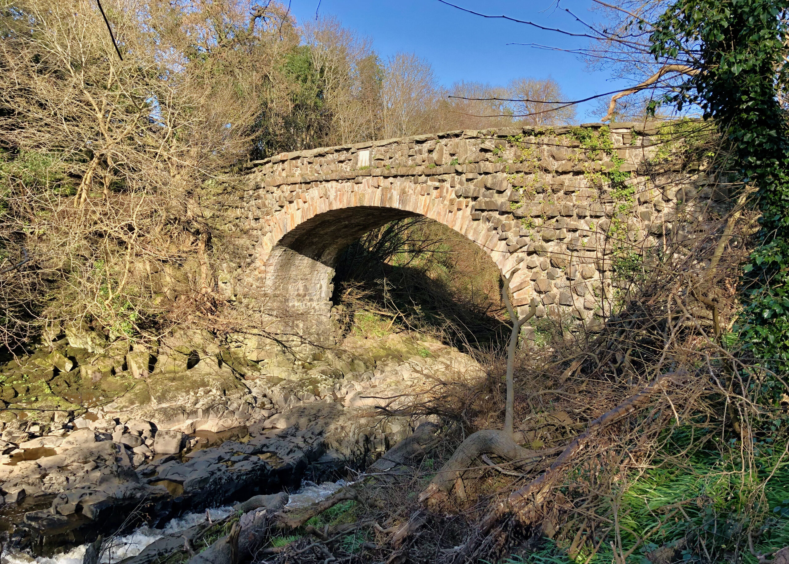 Cross the bridge, then bear right following a path signed for the River Almond Walkway. You’ll soon reach the ruin of Jock Howieson’s cottage (NT 18000 75380), which must have had a splendid view of the bridge. Past the cottage, bear left at a fork in the path then follow the steps down to the river’s edge and pass under the modern road bridge.