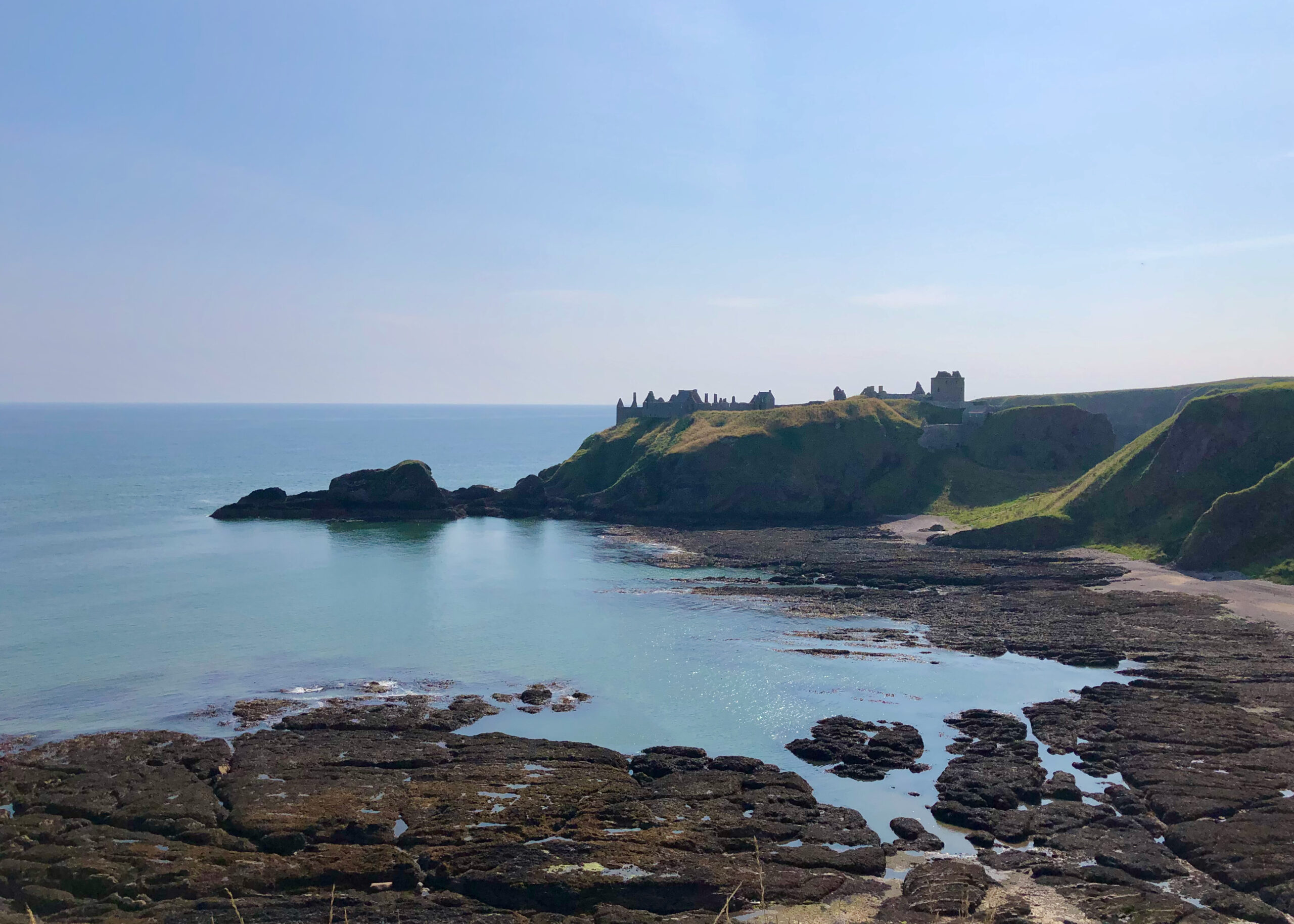 When you’re finished at the memorial, return to the main path and follow it along the cliffs high above Strathlethan bay. It’s hard to get lost, as Dunnottar Castle looms large ahead of you. At the end of the bay, the path leaves the cliff edge to cut across Bowdun Head (NO 87895 84600).
